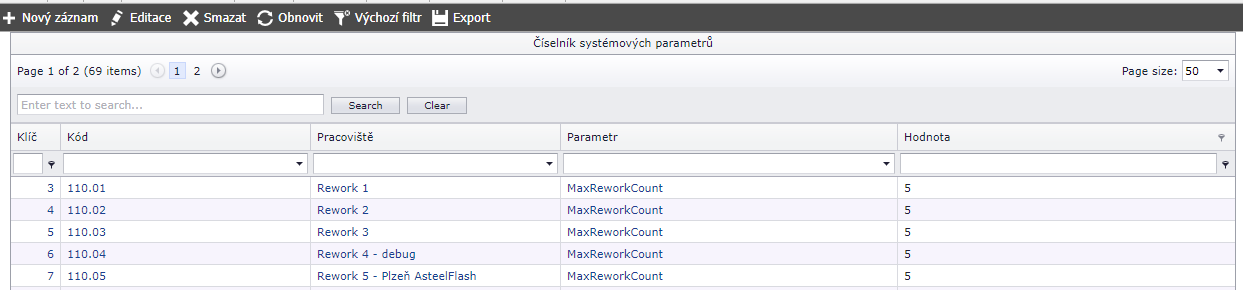 Parametr: Název systémového parametru, viz. Číselník systémových parametrů