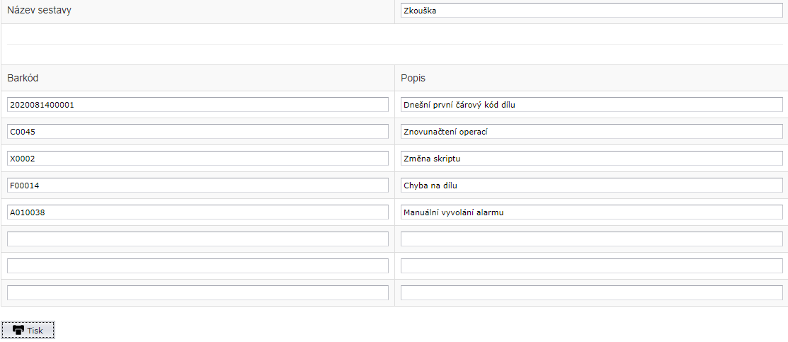 Stránka sloužící pro vytištění dodatečných kódů, které nepodléhají číselníkům, ze kterých by se dali snadno vytisknout.