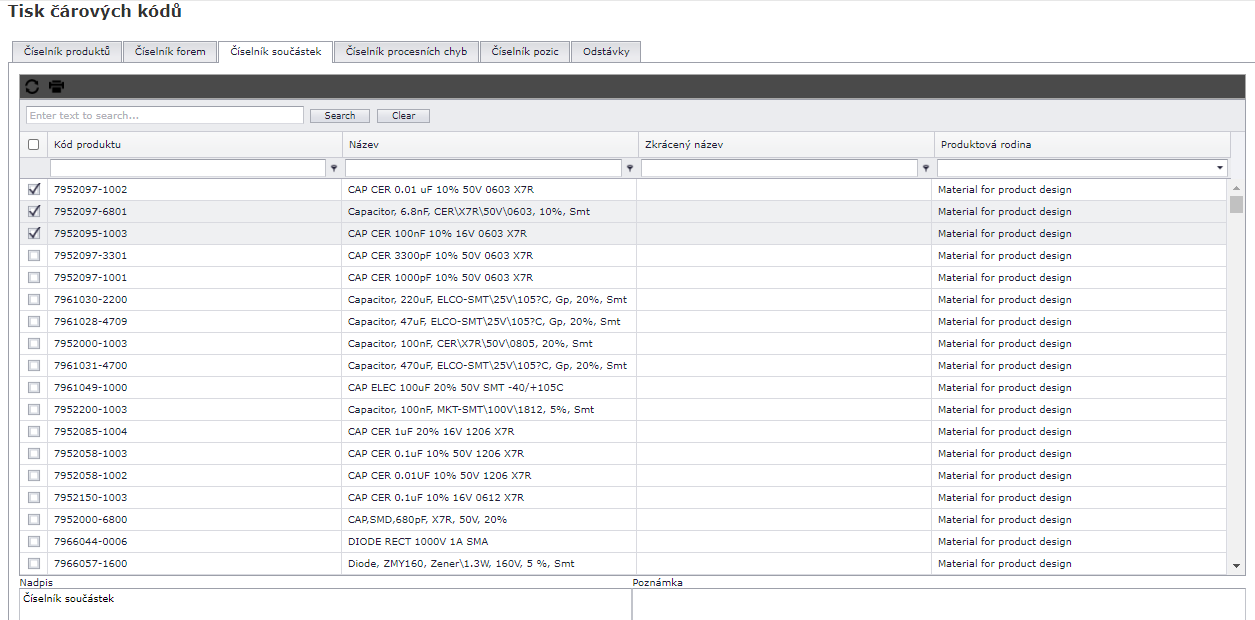 vyberte součástky u kterých budete chtít vytisknout čárový kód (checkbox - výběr)