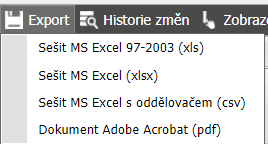 Export - umožnuje vybraná data nahrát z webového rozhraní do PC a to vybráním ze seznamu, jaký dokument chcete, aby Vám z dat vznikl.