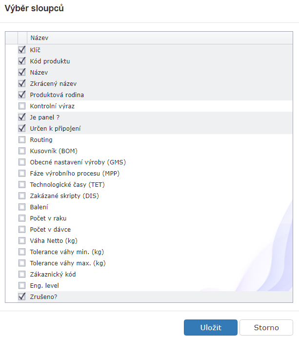 Některé čísleníky a pivotní tabulky obsahují velké množství informací. Uživatel si může zobrazit pouze informace, které chce vidět, pomocí možnosti Zobrazení => Výběr sloupců na nástrojové liště.