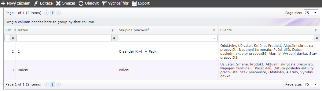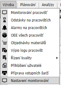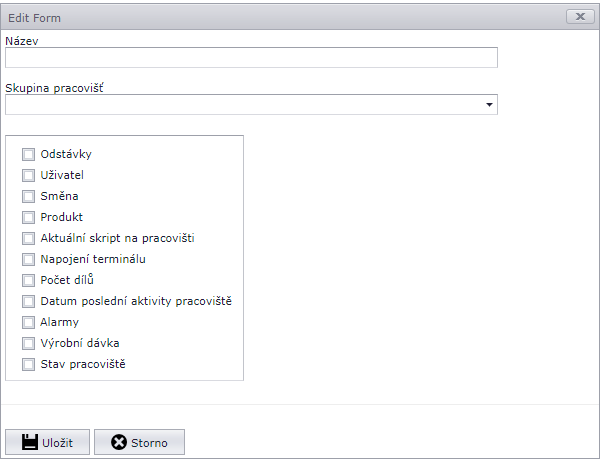 V této sestavě nastavujeme data pro zobrazení Skupiny pracovišť v sekci Monitorování a k tomu zvolené funkcionality, které se u dané skupiny pracovišť mají monitorovat