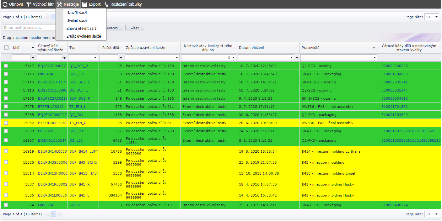 V záhlaví máme k dispozici Nástroje a tak je možné s výrobními šaržemi pracovat i na WEBu, pokud je zásah potřeba.