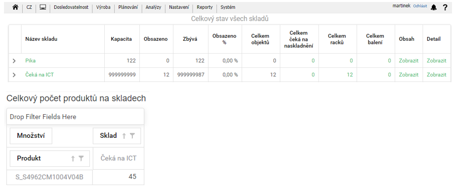 Zobrazení obsazenosti skladů a celkový stav jednotlivých produktů na skladech.