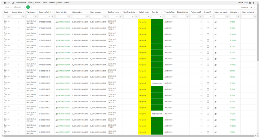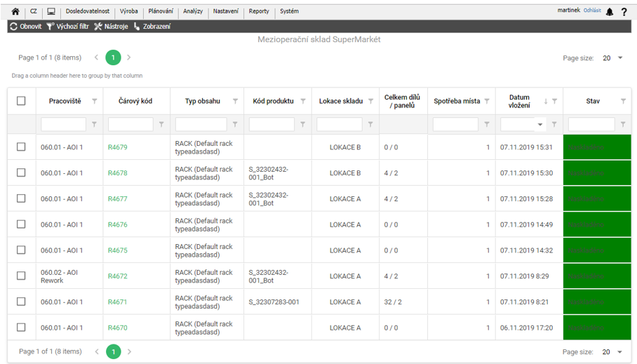 Ve sloupci OBSAH se dostanete na přehled o tom, které racky z jakého pracoviště a co obsahují. Jmenovitě seřazeno ve výchozím nastavení podle Data vložení.
