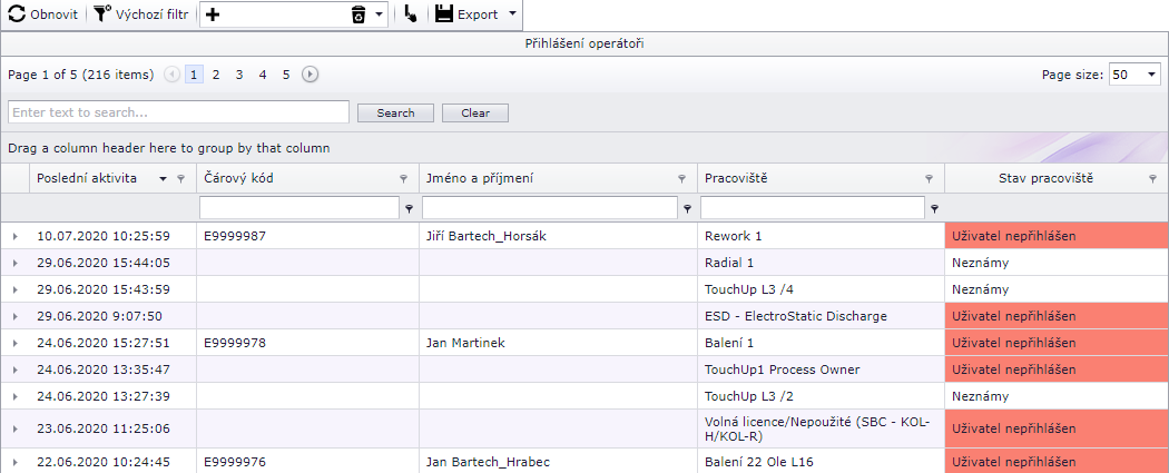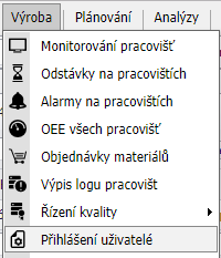 Sledování přihlášení jednotlivých uživatelů a jejich aktivita přihlášení ve výrobě na pracovištích