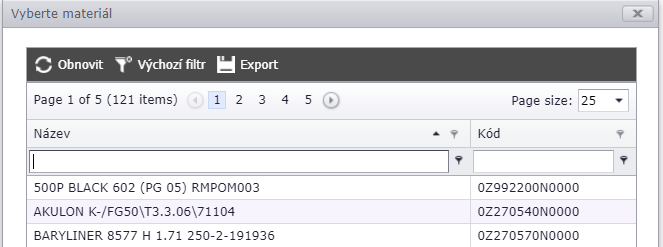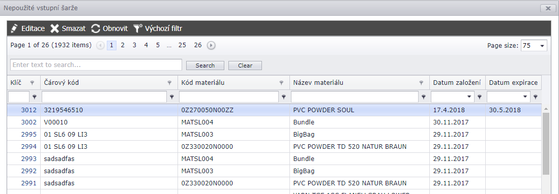 také je zde možnost smazání, nebo editace vybraných šarží materiálu