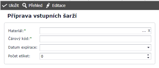 Pro zavedení, musí být vyplněny pole Materiál a Čárový kód (*)