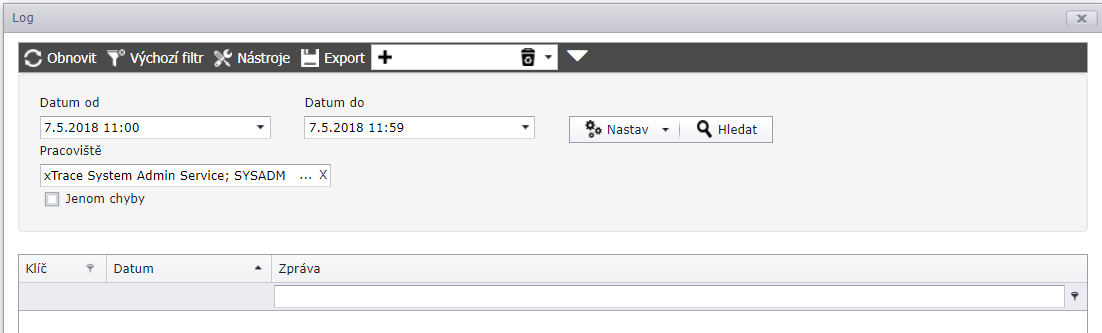 Pro zobrazení v jakém stavu se daná služba nachází klikněte na "Zobrazit log", kde se zobrazí okno s přednastaveným logování pro tuto službu, jen stačí vybrat období.