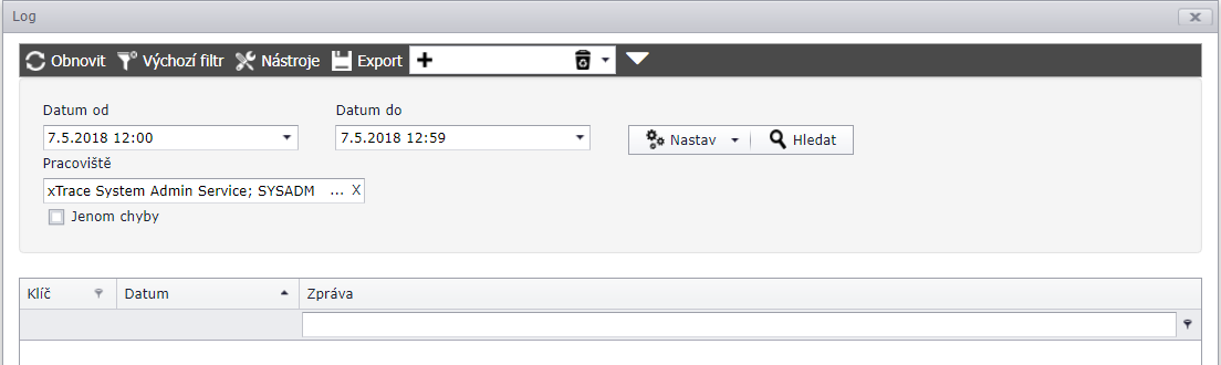 Pro zobrazení v jakém stavu se daná služba nachází klikněte na "Zobrazit log", kde se zobrazí okno s přednastaveným logování pro tuto službu, jen stačí vybrat období.