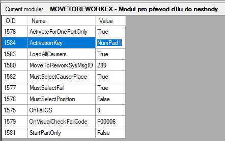 | MoveToReworkMessage | Kód systémové zprávy při čekání na identifikátor dílu. | MOVETOREWORK_WaitSN |