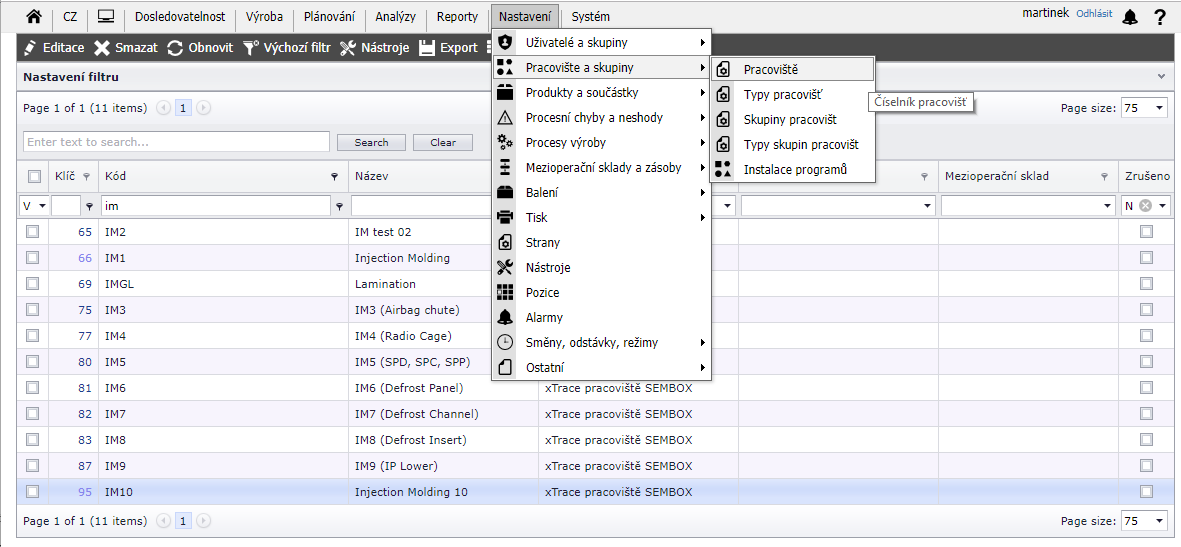 Tudy do nastavení jednotlivých pracovišť (ne skupin pracovišť) a vyfiltrovat si IM pro rychlé nalezení