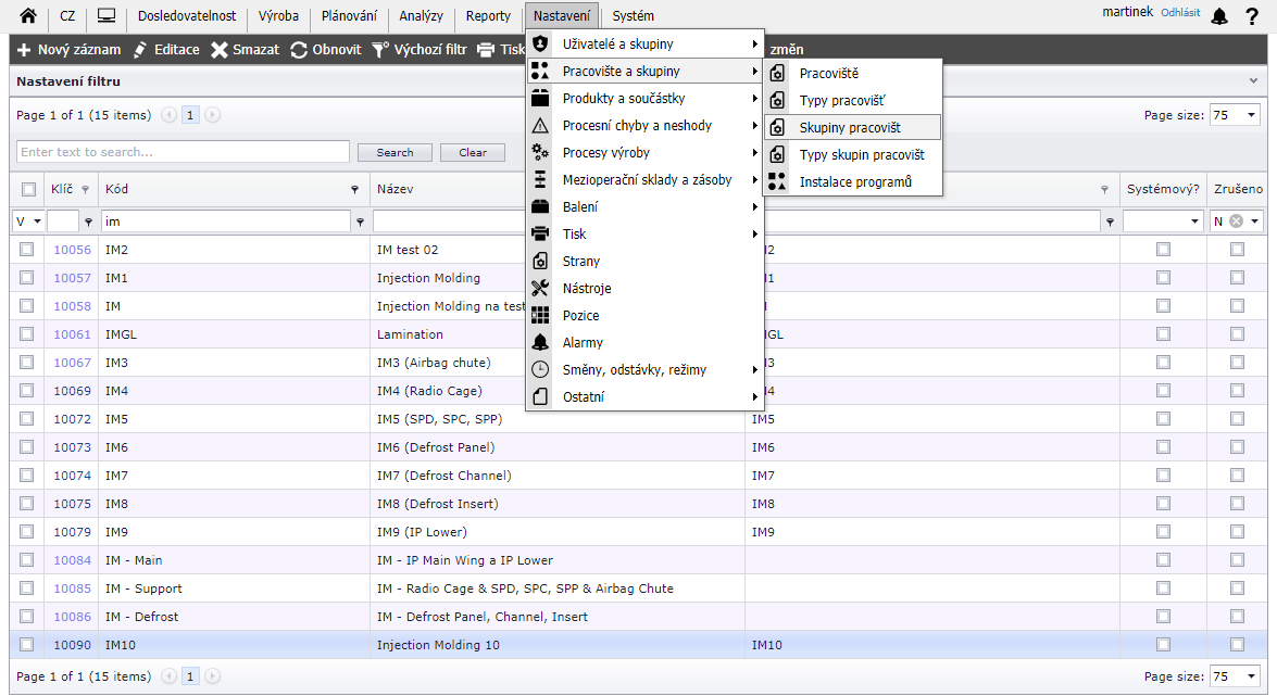 Tudy do nastavení skupin pracovišť a vyfiltrovat si IM pro rychlé nalezení