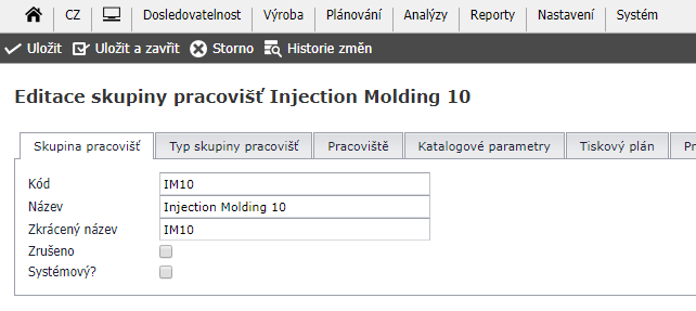 Na záložce "Pracoviště" můžeme zvolit, která pracoviště do této skupiny budou patřit (doporučuji nechat vždy jednu skupinu pracovišť pro pracoviště samotné a pokud je stejných pracovišť více, tak vytvořit novou skupinu a nenastavovat přímo tu, která je pro toto jedno pracoviště. V budoucnu může mít zákazník jiné požadavky co se bude na pracovišti vyrábět jinak než na ostatních a byla by to zbytečná práce navíc všechno upravovat a měnit.