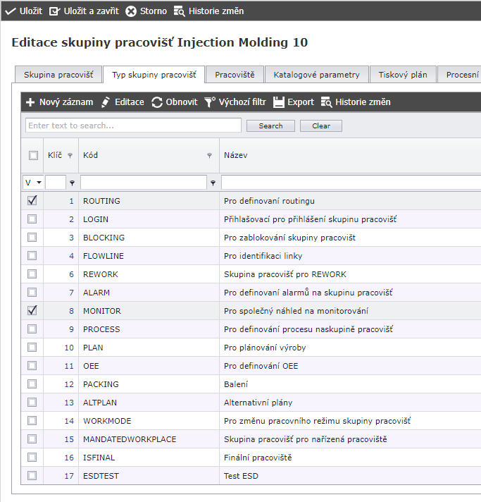 Typ skupiny pracovišť je asi nejzajímavějším nastavením, nastavení skupiny pracovišť. Nastavujeme zde, co vše je možné na pracovištích zaznamenávat.