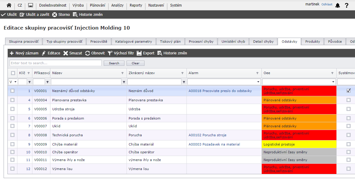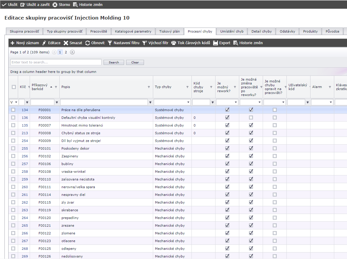Zde se dá také nastavit jaké procesní chyby bude moci operátor v této skupině pracovišť použít